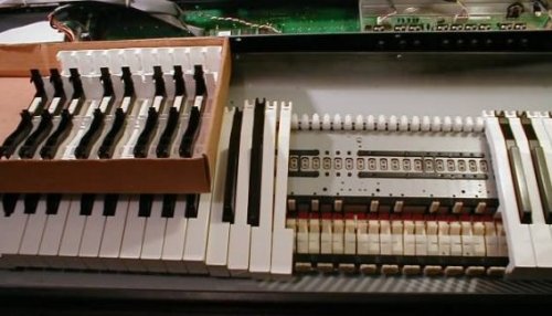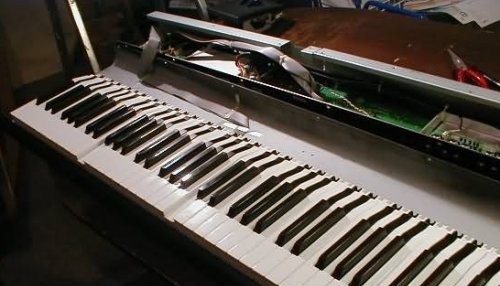 Und so sieht das Problem aus, wenn man den Kurzweil PC88 geöffnet hat. Die Hämmerchen befinden sich unterhalb der Tasten. Sie sind auf einer Welle gelagert und werden bei jedem Anschlag nach oben geworfen. Es gibt unterschiedliche Hämmerchen für die weißen und schwarzen Tasten.